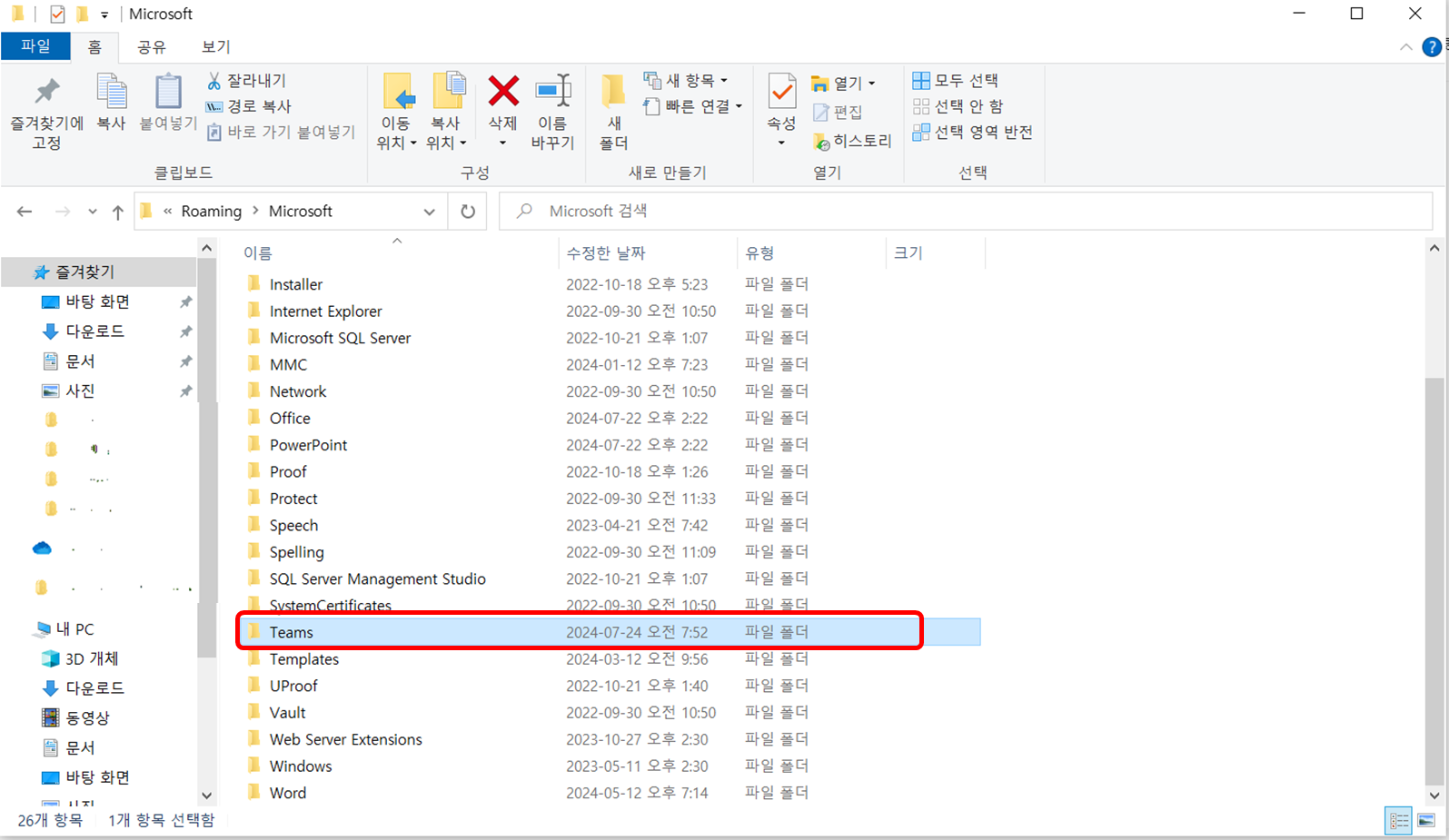 3. Teams 폴더를 찾아 삭제한다.