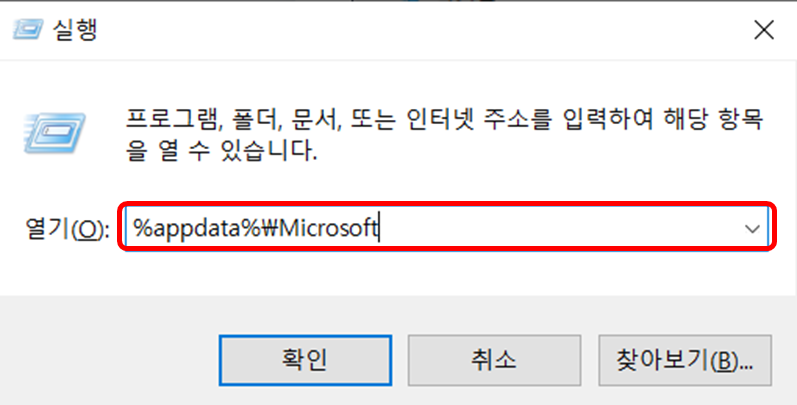 2. 실행창에서 %appdata%\Microsoft 을 입력한 후 확인을 클릭 한다.