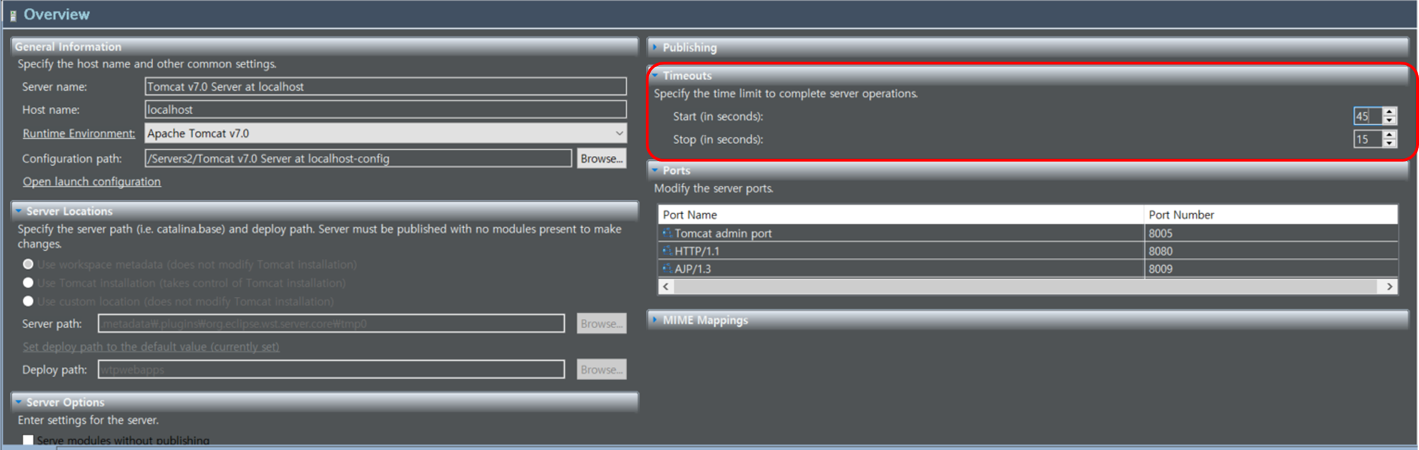 오류: Server Tomcat v7.0 Server at localhost was unable to start within 45 seconds.