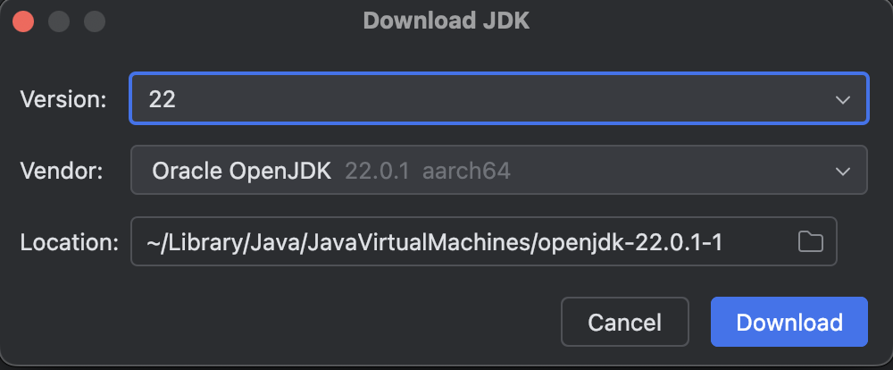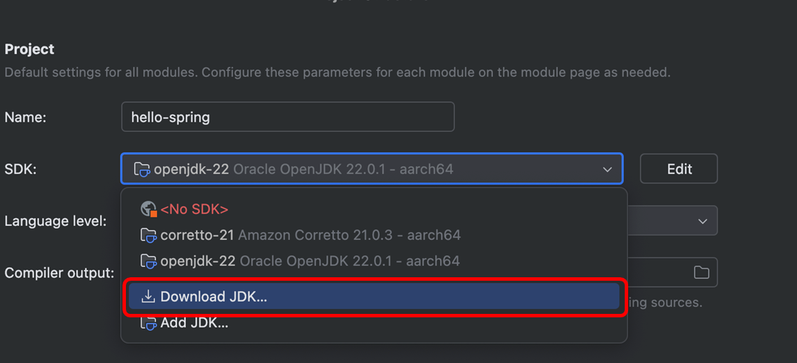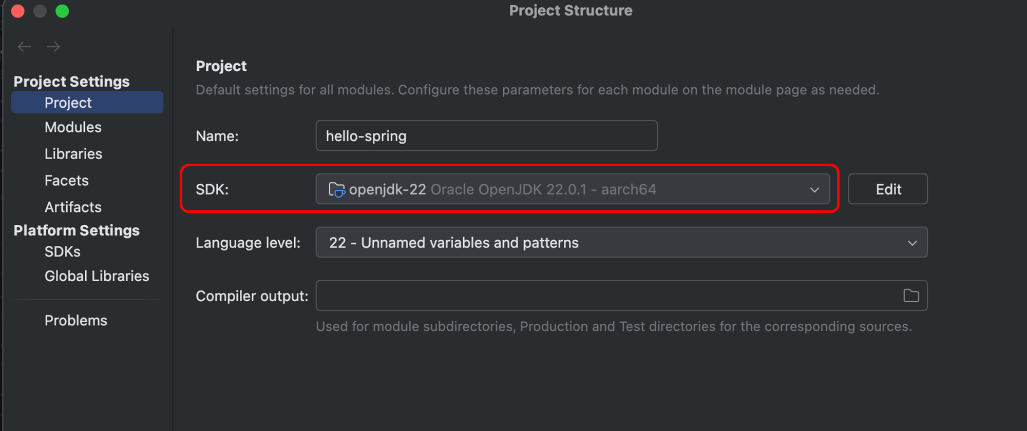 Project Settings에 JDK는 22버전으로 버전이 맞지 않는 것을 확인하였다. (File > Project Settings > Project > Project SDK 에서 확인 )