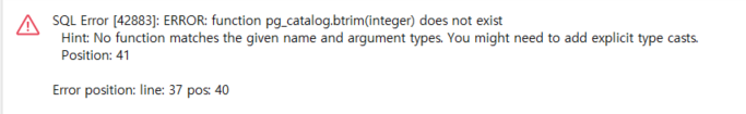 | [PostgreSQL] SQL Error [42883]: ERROR: function pg_catalog.btrim(numeric) does not exist (2) | 2024.07.10 |